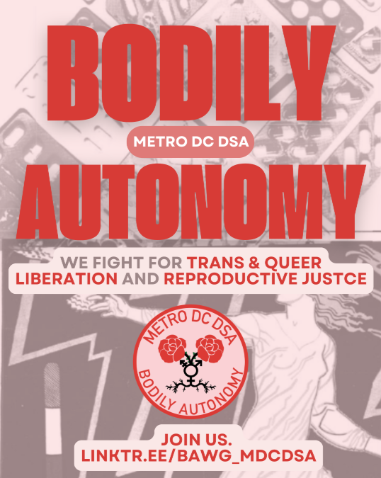 The Bodily Autonomy Working Group fights for queer, trans, and feminist liberation and against systems of patriarchal capitalist oppression that devalue women and LGBTQIA+ people, under the guidance of Reproductive Justice. We organize for the democratization of domestic and care work, political and social liberation for all genders, full bodily autonomy for all, and the end of state recognition of the gender binary.